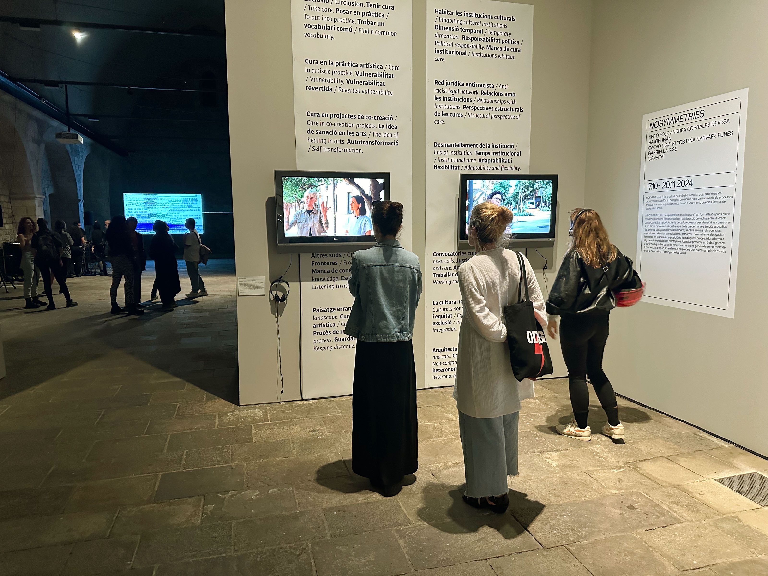 NOSYMMETRIES/EXHIBITION features works produced as a result of an artistic residence founded on collective interaction between various participants. The working methodology proposed by Idensitat involved structuring a collaborative process and predefining four specific areas of research: inequality and entry into the labour market; sex work and dissidence; the structures of racism: capitalism, the patriarchy and colonialism; and inequality and the ecology of care. The exhibition is the outcome of this process and gives shape to some of the questions raised. The works displayed are by Xeito Fole - Andrea Corrales Devesa, BajoRufián, Cacao Díaz - iki yos piña narváez funes - Florencia Brizuela - Ainhoa Nadia Douhaibi, Gabriella Kiss – Impulsem - and Idensitat. Idensitat presents a work created on the basis of the questionings, reflections and tensions that have arisen in the framework of the residence, with an archive of voices in progress, the aim of which is to broaden the gaze between non-symmetry and the ecology of care.